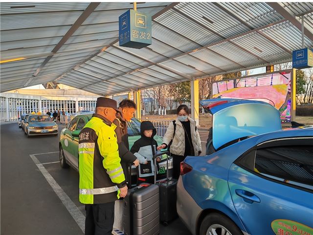 “11号!”网约车司机师傅电话那端传来声音,“什么11号?”站在网约车上车点的乘客略感疑惑,执法人员指一指他面前的停车位站牌,乘客瞬间明白,“这就是11号!”这是交通运输保障服务众多场景中的小插曲。新网约车点形成了清晰的“一体同向有序”换乘流线,实践中,十分有利于旅客便捷出行。旅客从出站口开始,可沿指示依次经过公交车乘车区、出租汽车候客点,最终顺畅抵达网约车上车点,有效减少了不必要的绕行或走错折返,实现有序引导。