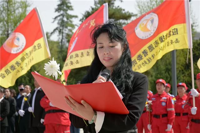 活动由中志协应急委西安服务队队长薛江红主持,现场庄严肃穆,全体人员手持黄白菊花列队肃立。老兵学院军乐队奏响国歌,拉开仪式序幕。陕西省爱心济困协会封悦恭读祭文,字字句句饱含对先烈的追思;陕西省银铃大学老兵学院院长王相亭领誓,全体人员重温入党誓词,誓言铿锵。