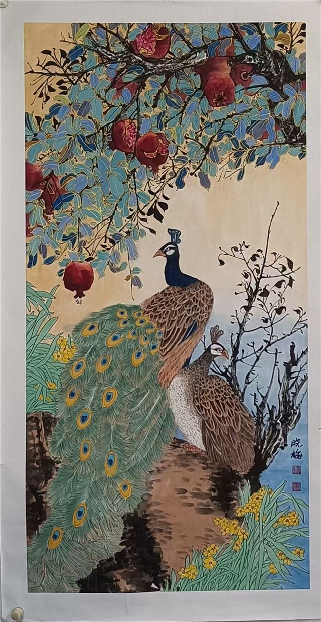 在彭晓梅老师看来,画家在宋庄要想生存和发展下去,主要还得看作品,在其刚来宋庄时,她的作品都是以乡村背景+道教人物为题材的,一幅幅颇有烟火气味道的作品,曾一度供不应求,但随着时间的推移和市场的变化,她不得不在创新中再谋求新的发展空间。为此,宋庄的艺术在变,宋庄的江湖深浅亦在变,短视频、快手、抖音及直播间的冲击,让她的画风一变在变,十年来,她画山水、人物、花鸟,动物、白描、重彩涉猎颇多,别人画的题材她会画、别人不会画的,她总是在临摹中探索着画,渐渐地脑海里明晰了什么是艺术价值、什么又是市场价值,这两种价值又用自己的笔怎样平衡,当她的思维逻辑到了这个高度时,彭晓梅老师也逐渐将国画的工笔技法转变成了兼工兼意的技法特征,勤奋、天赋、技法、人脉、思想、品德、市场与艺术的平衡点等等元素的共融,让她常常自我陶醉。不识庐山真面目,只缘身在此山中。十年磨一剑、也可以说十年磨一变。与十年前相比,彭晓梅现在的作品,已彻底看不出行画之气,取而代之的雅而不俗,艳而不媚。