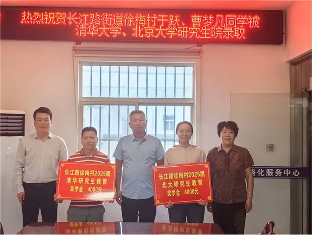 这场捐资助学活动,是徐梅村长期以来倾心关爱学子成长的一个缩影。而将目光回溯到2025年8月14日,另一幅同样动人的画面在村中呈现:村委会里掌声阵阵,气氛热烈。村党总支为2名即将踏入中国最高学府的硕士研究生——曹梦凡和于跃,举行了一场简朴而隆重的颁奖仪式。曹梦凡以优异成绩考取北京大学,于跃则被清华大学录取。当从老书记徐凯模手中接过象征着家乡骄傲与期待的奖学金时,两位学子眼含热泪。