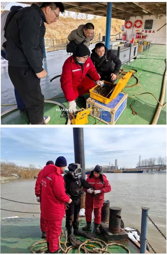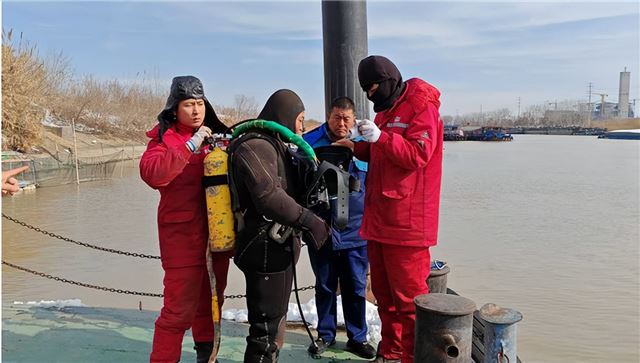 1月21日,淮安市洪泽区苏北灌溉总渠波光粼粼,寒风袭袭。在一艘名为“阳光油趸1号”的趸船旁,来自淮安市交通运输综合行政执法支队“爱心船检”团队的郭彪、赵春阳2名验船师没有像往常一样安排船舶进坞。一名身着潜水服的专业人员身系数根彩色管线,缓缓入水,在验船师监督、团队协助下潜入河中,一场颠覆传统的水下船检在淮安首度展开。