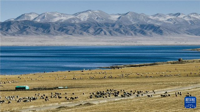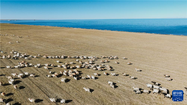 冬日,在青海省海南藏族自治州共和县江西沟镇附近的青海湖湖畔,牧民赶着羊群在这里放牧,湛蓝的湖水与羊群相映成景,绘就一幅冬日牧羊图。