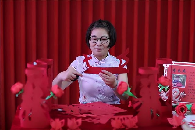 活动最引人注目的环节是特邀我市非物质文化遗产剪纸传承人李玉凤大师现场展示技艺。大师为新人精心创作了多幅剪纸作品作为新婚贺礼:栩栩如生的“比翼双飞”手环,象征新人同心同德、携手前行;娇艳欲滴的“玫瑰花”,寓意爱情永恒、生活美满;细腻传神的“夫妻恩爱”图,勾勒出举案齐眉、温馨和睦的家庭画面。每一幅作品都凝聚着对美好婚姻的诚挚祝福,将传统文化底蕴与对新人的关爱融为一体,赢得现场阵阵赞叹。