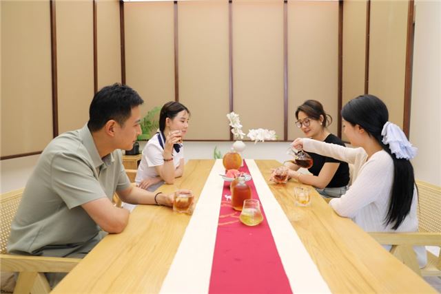 2025年7月15日,在安徽省黄山市屯溪区一处茶空间,游客在体验新中式茶饮。新华社记者 曹力 摄