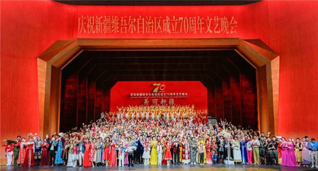 9月24日晚,庆祝新疆维吾尔自治区成立70周年文艺晚会《美丽新疆》在乌鲁木齐文化中心大剧院举行。新华社记者 申宏 摄