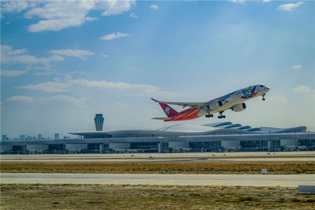 9月15日,一架飞机从乌鲁木齐天山国际机场起飞。新华社记者 陈朔 摄