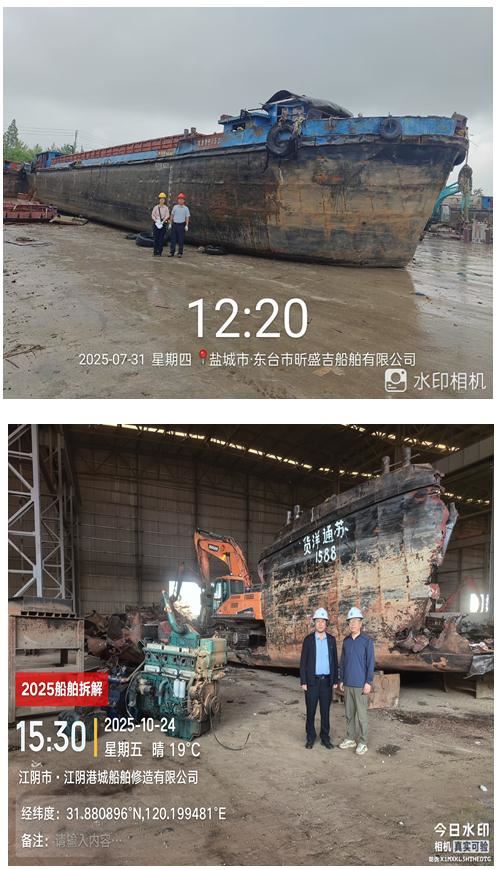 任务期间,执法人员用坚守诠释担当:7 月的盐城拆解点,地表温度最高突破 40℃,他们顶着烈日逐船核对船舶识别号、主机型号、船体尺寸,汗水浸透衣服也未漏过任何一个细节;10月的江阴,深秋寒风凛冽,他们又放弃周末及节假日休息,每天清晨便赶赴拆解现场,紧盯切割、起吊、废弃物处理等关键环节。“每一艘船的拆解档案,我们都要做到‘船证相符、照片留痕、流程可溯’。” 执法人员葛和耀介绍,为杜绝 “假拆解、拆而不净” 问题,他们创新采用 “一船一档、全程录像” 监管模式,对船舶拆解前、中、后三个阶段进行全方位记录,累计行程超 2000 公里,签署监管报告 10 份,确保每一艘拆解船舶都严格符合国家规范。